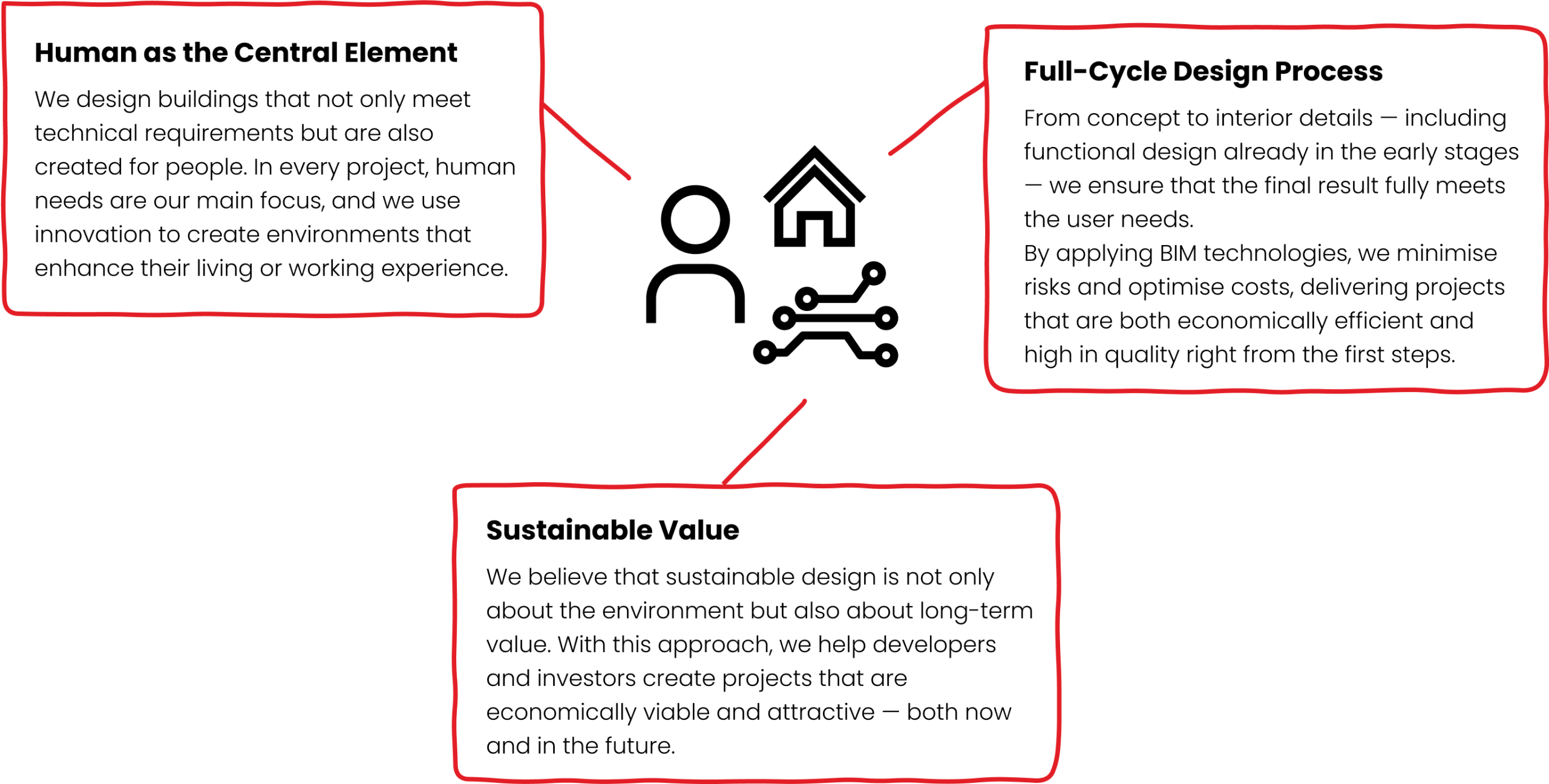 We are an international team of professionals — designers, architects, and BIM experts — combining design thinking methodology with technological precision.
